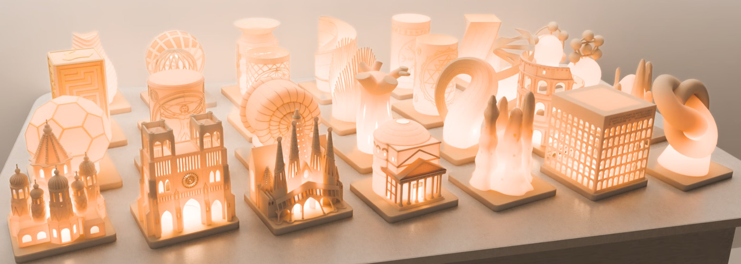 You print one magnetic base and 28 interchangeable shades—each inspired by architecture, nature, geometry, symbols and sci-fi. No wiring changes, no reprints for every mood. Just slide a new shade on in seconds.